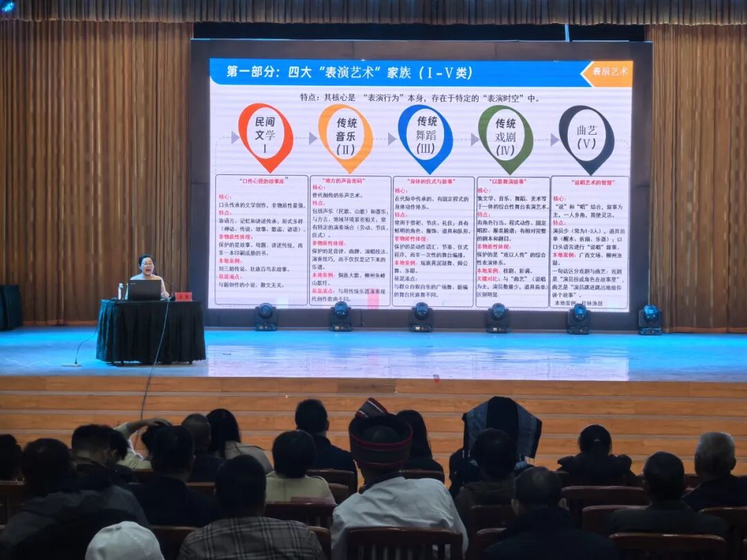 授牌结束,培训随即开讲。广西科技大学研究员、非物质文化遗产研究中心负责人高静受邀授课,以《理解、保护与传承》为题,深入剖析非遗传承的核心要义,回应传承人在实践中遇到的困惑。课程内容涵盖非遗政策解读、技艺提升实操、传承创新路径、数字化传播技巧等核心模块,兼顾理论深度与实践指导性,为学员量身打造一套“让非遗活在当下”的柳江实践方案,推动柳江非遗真正“活起来、传下去”。