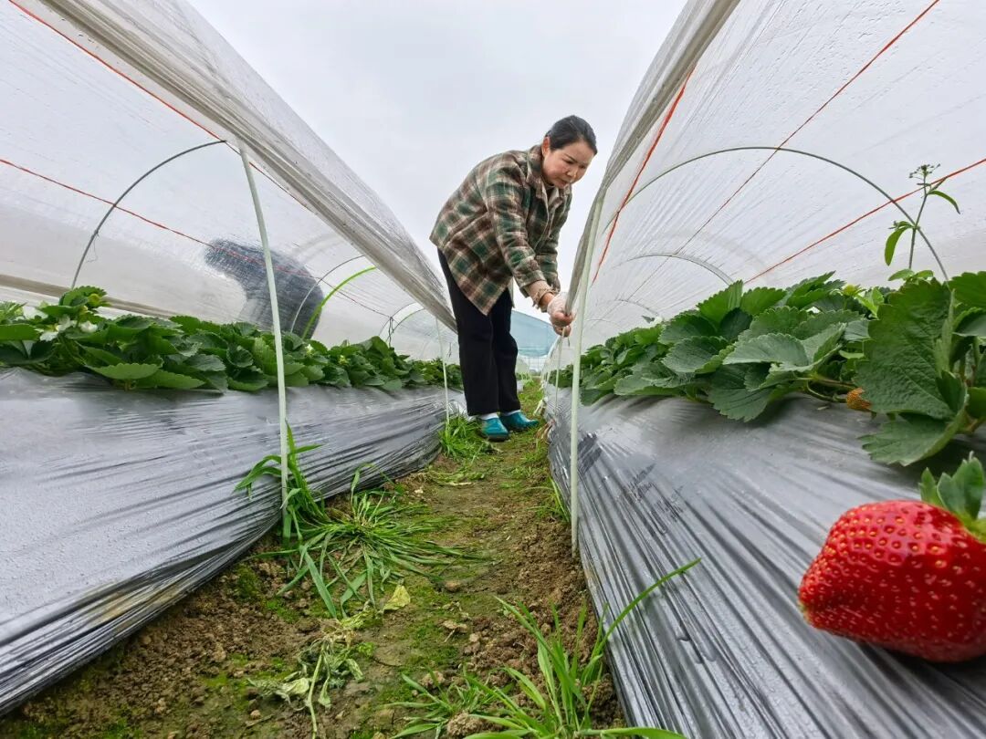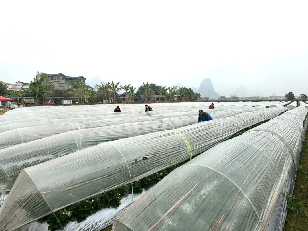 草莓基地里,同样一片忙碌。连绵阴雨并未打乱节奏,负责人韦柳梅正带领村民为草莓园加盖防雨膜。“种草莓十年了,从10亩扩大到20亩,靠的就是精细管理。”她俯身查看草莓长势,“眼下正是关键期,香野奶油草莓和甜查理草莓陆续成熟,必须做好防雨防病,才能保证采摘品质。”
