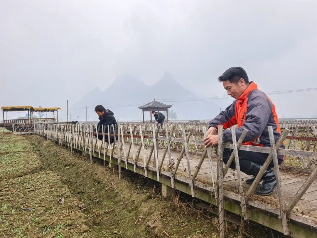 在景观花卉种植基地,两周前播下的花种已悄然破土,嫩绿的新芽在细雨滋润下舒展身姿,芽尖挂着晶莹的露珠。村民们在雨中加紧维护观光栈道,安装防护栅栏。上个月刚返乡的青年覃钟喜,如今已是运营团队的一员,他不仅入股参与建设,更全身心投入到基地的日常管护中。