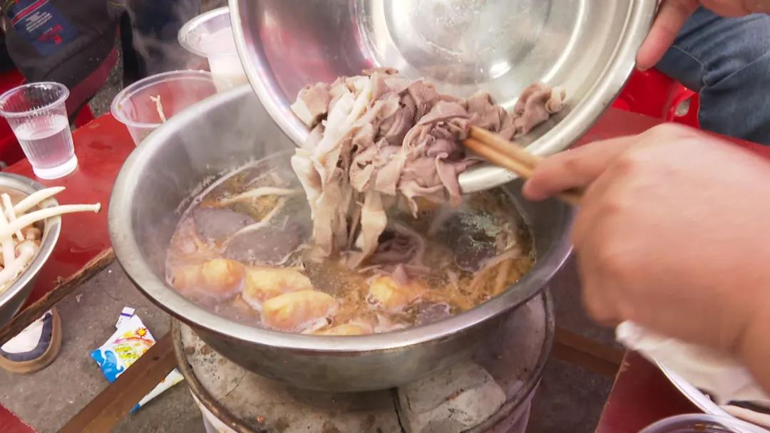 采访中记者了解到,打边炉的食材都是食客们在市场里现买的。大家挑选自己喜爱的牛肉、牛杂,猪肉、猪杂以及蔬菜,来到市场里的米粉摊,交给老板腌制。二十块钱一份炉火和汤底,丰富、独特的早餐就这样热腾腾地开吃了,这份热闹从清早六点米粉摊开摊营业一直持续到中午。