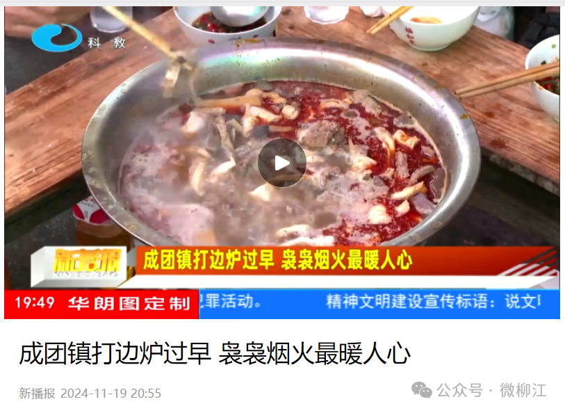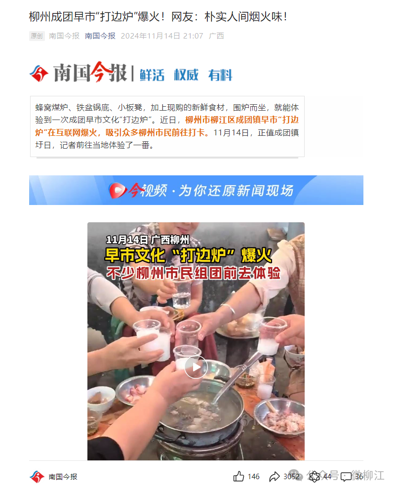 近日,柳江区成团镇早市“打边炉”火出圈,新华社、新华网、《南国今报》《新播报》等主流媒体,分别以题为《可爱的乡村——成团镇的早市“百家宴”》《柳州成团早市“打边炉”爆火!网友:朴实人间烟火味!》《成团镇打边炉过早 袅袅烟火最暖人心》进行报道。