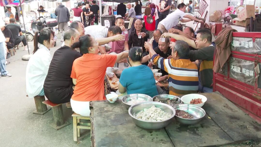 小煤炉火锅、简易的桌椅、现切的新鲜食材,大家围炉而坐,互相聊着家长里短,欢声笑语间如共进邻里百家宴……因其独有的烟火气和浓浓的人情味,成团镇早市走红网络,吸引越来越多市民和游客前来打卡,体验别具风格的乡村早市文化。
