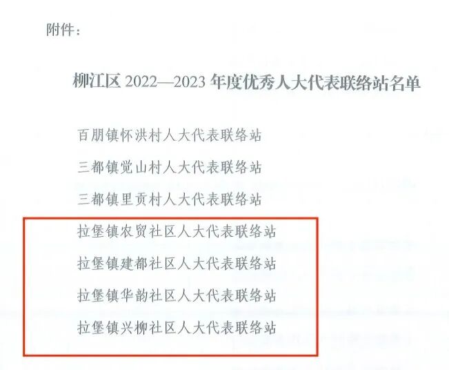 代表履职平台建设亮点纷呈。结合镇党委中心工作,推进人大代表联络站规范化建设,突出“联络站+社会治理”、“联络站+乡村振兴”品牌建设。拉堡镇农贸、建都、兴柳、华韵4个社区人大代表联络站被评为“柳江区2022-2023年度优秀人大代表联络站”。
