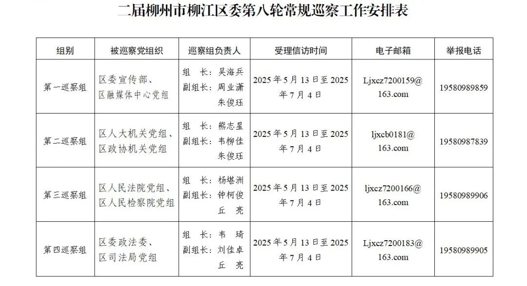 根据区委部署安排,2025年5月13日至2025年7月11日,开展二届柳州市柳江区委第八轮常规巡察。现公告如下: