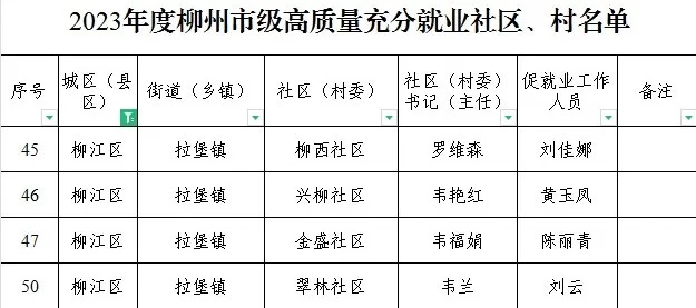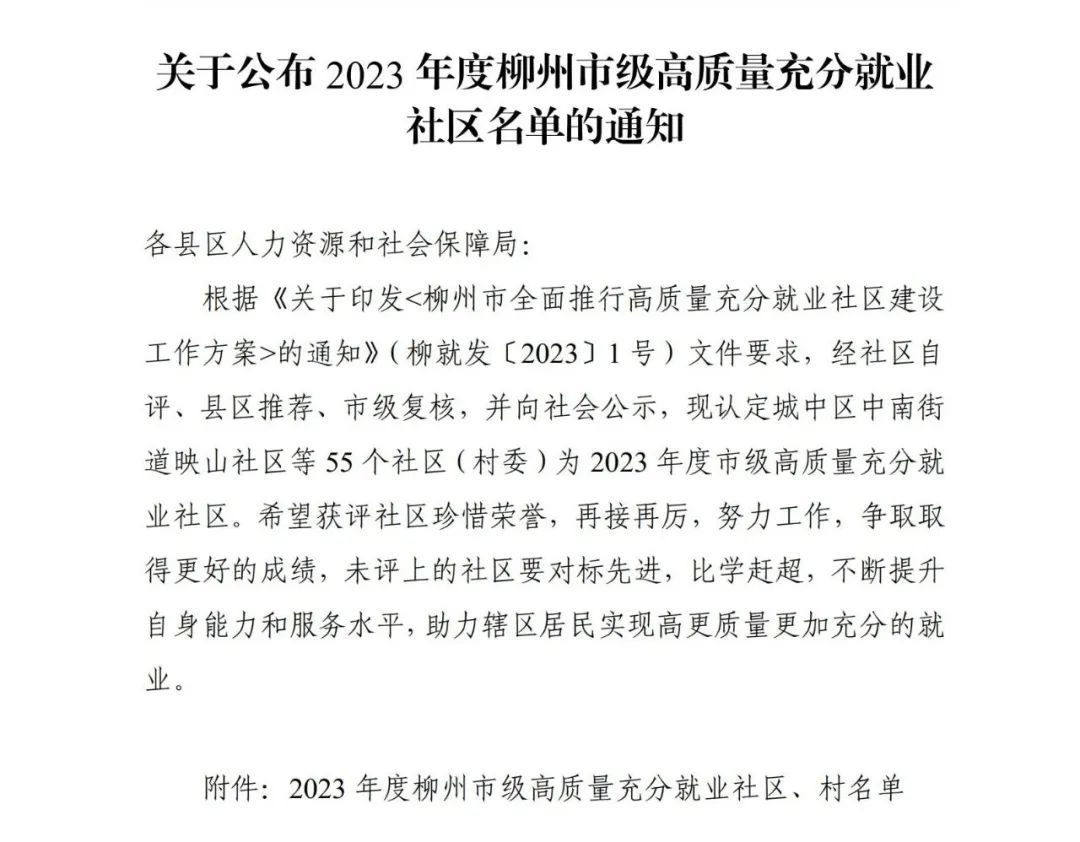 近日,柳州市人力资源和社会保障局公布《关于公布 2023年度柳州市级高质量充分就业社区名单的通知》,柳江区拉堡镇柳西社区、兴柳社区、金盛社区、翠林社区荣获2023年度柳州市级高质量充分就业社区称号!