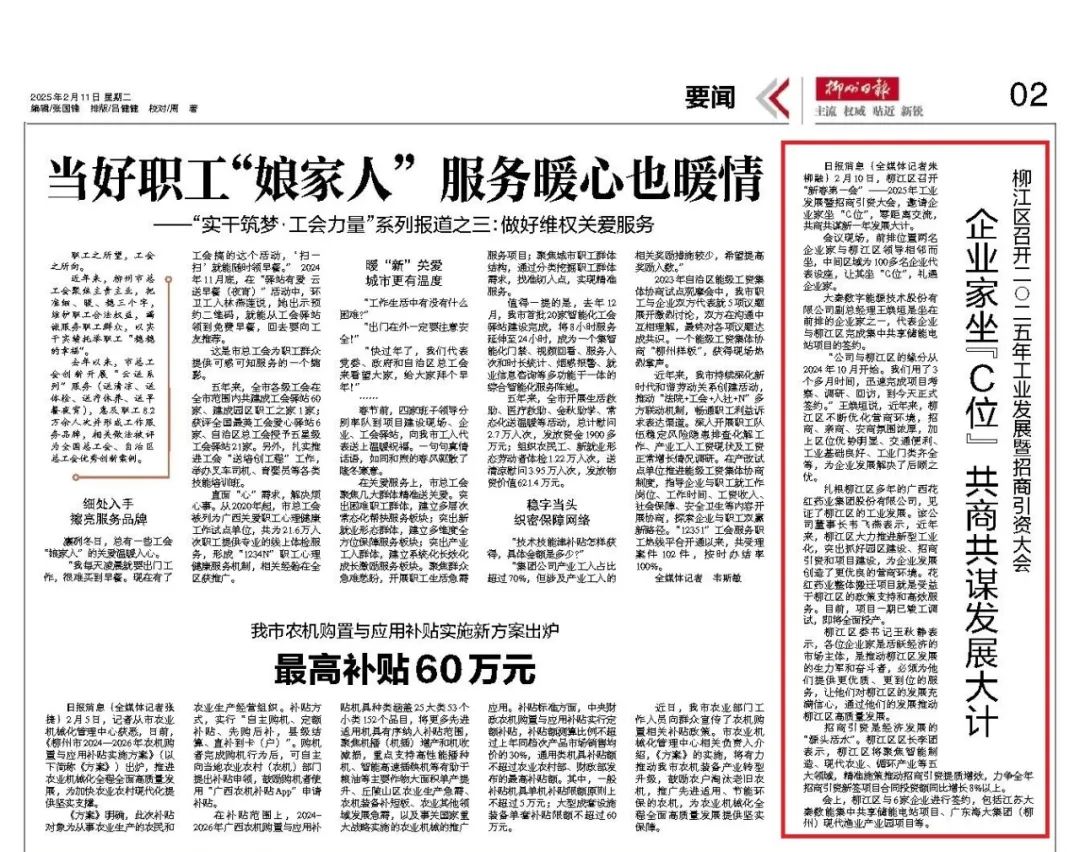 2月11日,《柳州日报》要闻版以《柳江区召开2025年工业发展暨招商引资大会——企业家坐“C位”,共商发展大计》为题,聚焦柳江“新春第一会”。此次会议邀请100余名企业家代表坐在“C位”,与政府零距离交流,共同谋划新一年的工业发展与招商引资大计,展现了柳江区推动高质量发展的决心与信心。