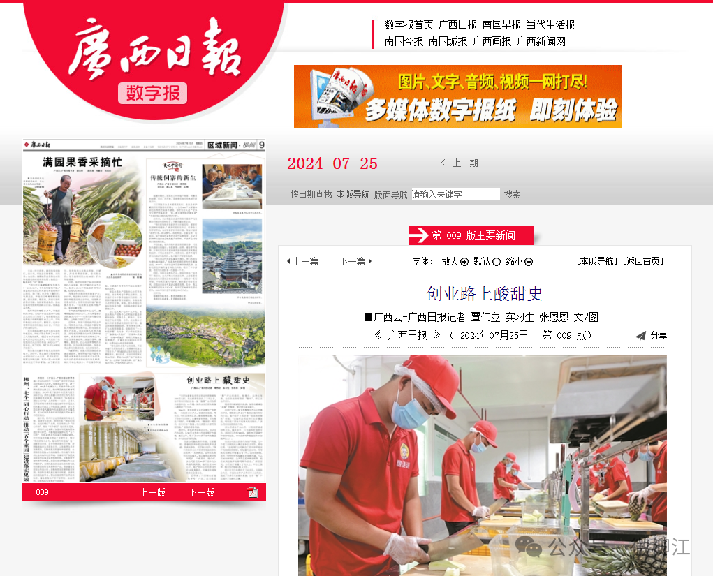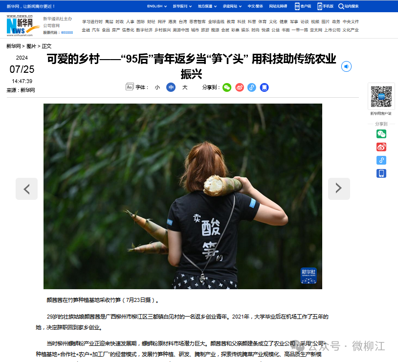 7月25日,新华社、广西日报聚焦柳江螺蛳粉原材料酸笋特色产业和“酸”产业发展,分别以题为《可爱的乡村——“95后”青年返乡当“笋丫头” 用科技助传统农业振兴》《创业路上酸甜史》进行报道,展现柳江区用科技助传统农业发展,全力推动产业标准化、规模化、品牌化发展,助力乡村振兴蓬勃发展的态势。