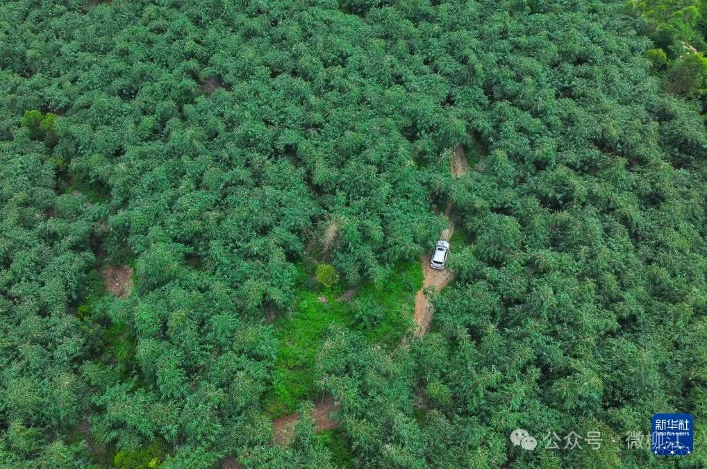 颜茜茜驾车来到竹笋种植基地,准备采收竹笋(7月23日摄,无人机照片)。
