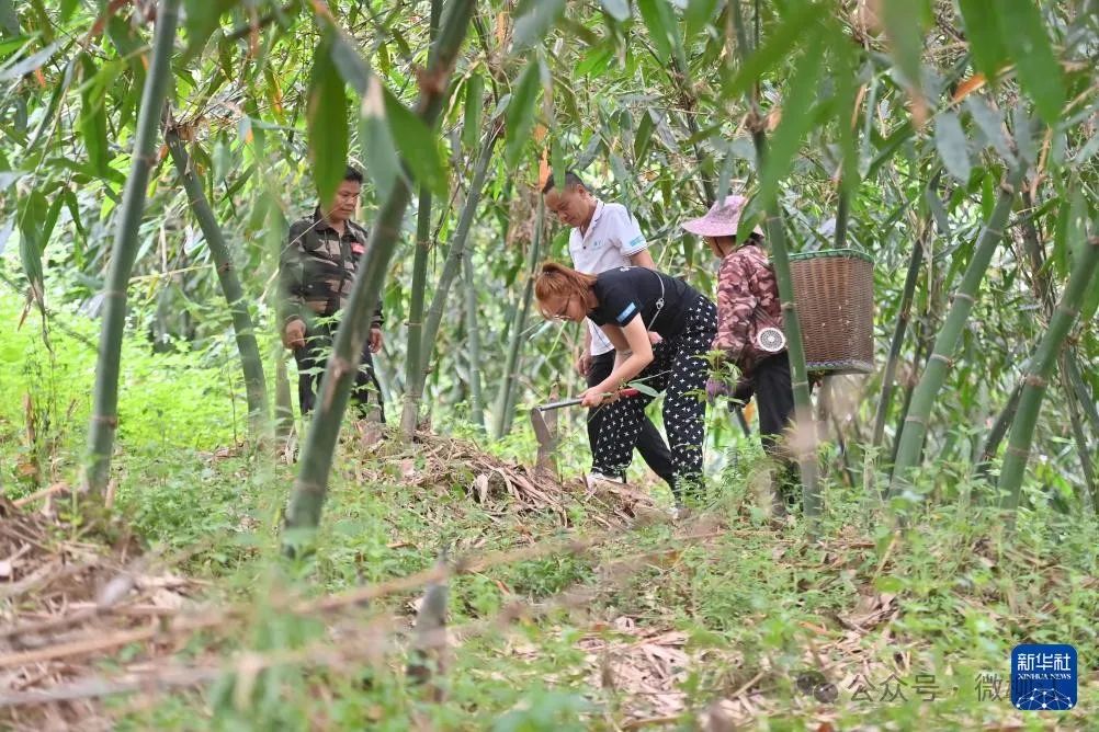 颜茜茜(右二)和父亲颜建条(右三)在竹笋种植基地采收竹笋(7月23日摄)。