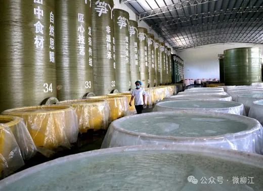 在该公司庞大的现代化生产车间,几十个两三层楼高的大罐沿墙如巨人列队,蔚为壮观。“这是我们公司联合广西大学研发设计的玻璃钢发酵罐,存储量可达30吨,而传统的发酵缸存储量只有1吨。这些发酵罐,采用了特殊材料模拟陶缸的发酵环境,可以在线发酵调控、全周期监控发酵进程等,能有效调控酸笋发酵周期和品质。”颜茜茜说,公司设计储量1万吨以上,年加工酸笋、酸豆角产能超过1.5万吨。