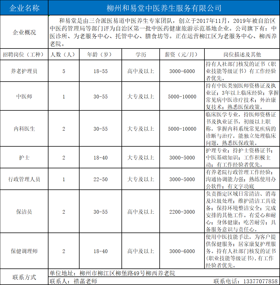 1、柳州和易堂中医养生服务有限公司