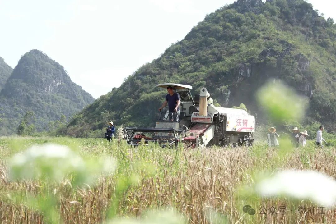 近日,记者走进位于百朋镇小山村的柳江区冬闲田开发春收小麦高产综合技术集成应用实验示范区。麦浪翻滚,满目金黄,收割机在麦田里来回穿梭,一颗颗麦粒“跳跃”归仓,奏响了丰收的乐章。小麦种植大户韦建康开着收割机忙碌着,他竖起大拇指称赞道:“这批冬小麦在一周后就能收割完毕,我们立即开启早稻种植,小麦种植很好地填补冬闲田的‘档期’。如今,同样一块地,可以实现‘早稻、晚稻、小麦’三造连续种植,进一步增加群众收入,这就是科技的力量。”