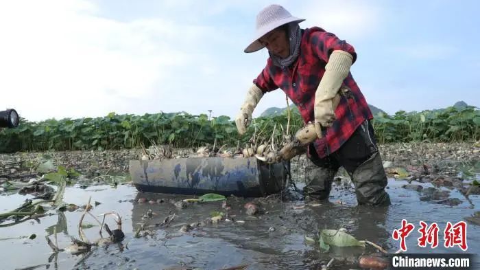 图为村民在采挖莲藕。兰德波 摄