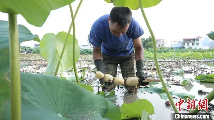图为村民在采挖莲藕。周梦玉 摄
