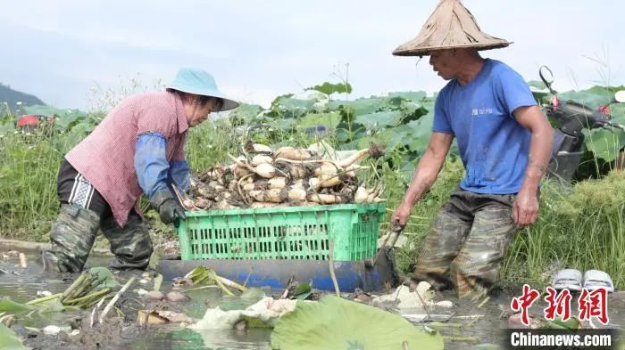 图为村民在装运玉藕。兰德波 摄