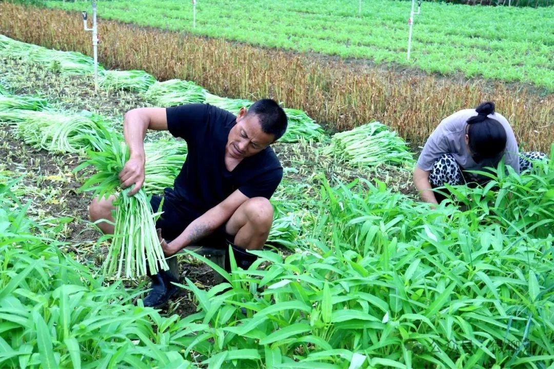 6月13日,记者走进拉堡镇基隆村陈家屯的田间地头,只见一垄垄空心菜郁郁葱葱,长势喜人。种植户们蹲在田间,手持镰刀,熟练地将鲜嫩的空心菜割下码放整齐,田间地头一派繁忙景象。