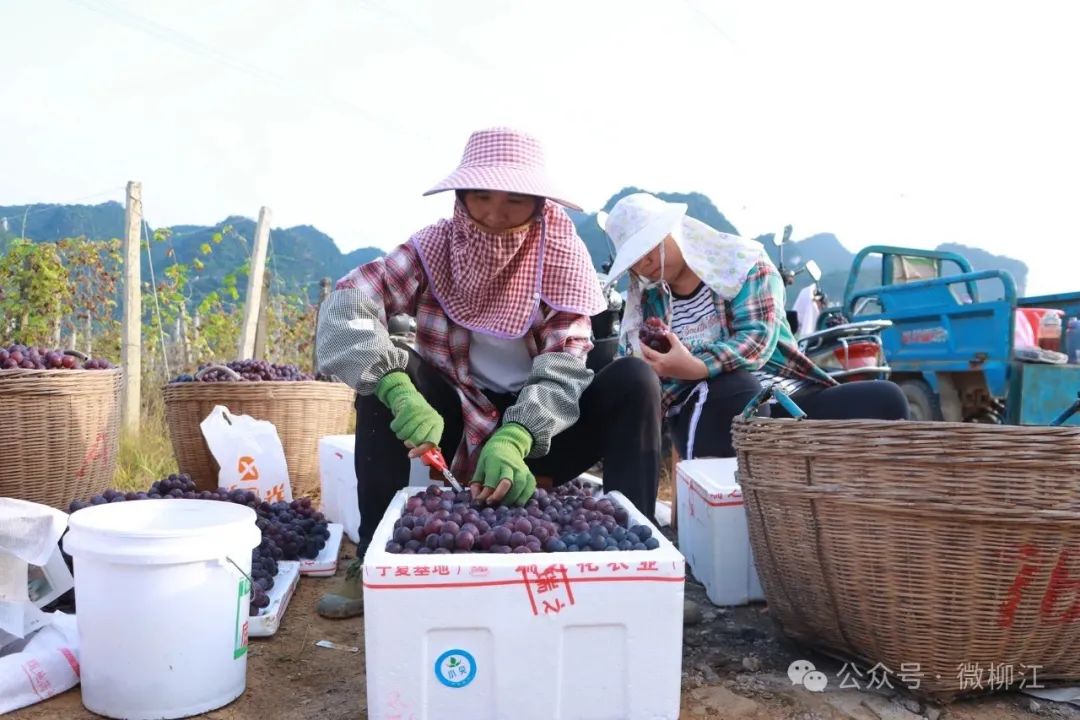 盛夏时节,柳江区成团镇鲁比村葡萄大棚内一片生机盎然,整齐的葡萄架上,深绿藤蔓如绿色绸带缠绕攀爬,一串串葡萄紧密簇拥,颗颗饱满,似紫宝石般在阳光下闪烁诱人光泽,浓郁果香弥漫在空气中,宣告着又一个丰收季到来。
