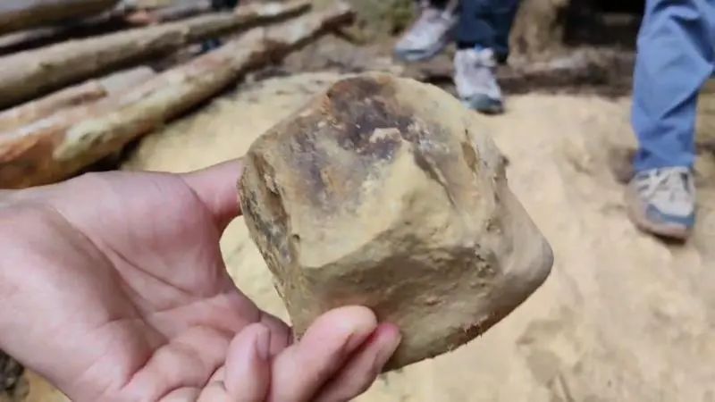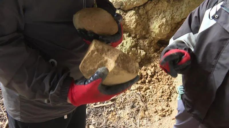 专家解释,这个溶洞处在群山之中,石具被发现区域的泥土与溶洞内的土壤一致,因此排除了石头泥土为现代人搬运来的可能。专家还表示,古人一般使用两块石头配合来敲打东西,现在发现的这块是石核,相当于“底座”,那么,跟它配套的应该还有另一块用作敲打的石头。依据这个理论,考古队继续对这一处泥土进行挖掘。果然在附近发现了第二块石具。“底座”和“锤子”组成的一对石具被找到了,这让考古队员们兴奋不已。
