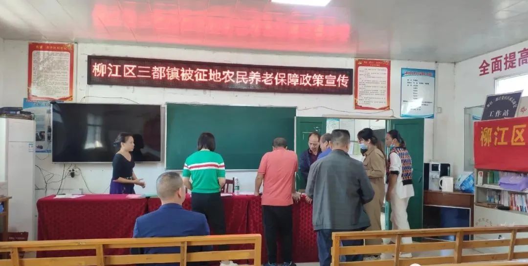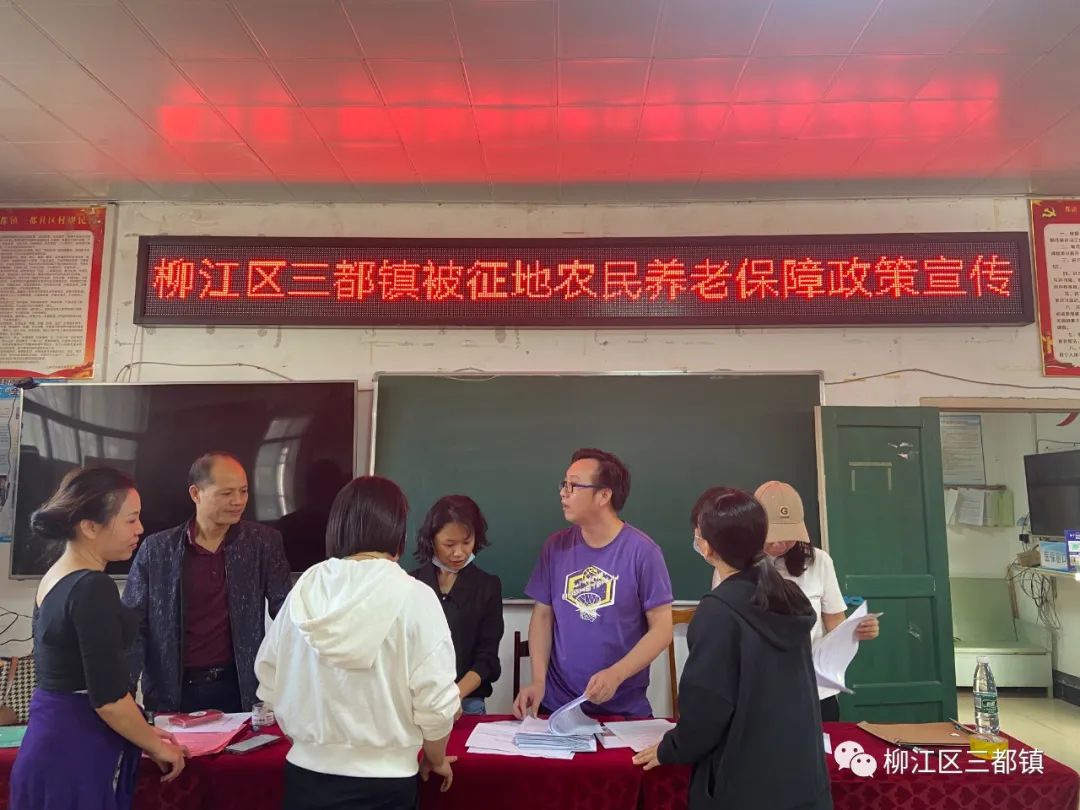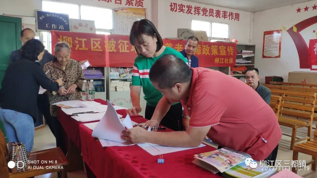 现场,柳江区社保中心和三都镇社会事务综合服务中心工作人员现场收集材料、指导填写,对困惑问题一对一解答,就被征地农民养老保险参保险种的选择,缴纳保费补贴等进行讲解,引导村民根据年龄段和已参保险种类别选择适合自己的保险。