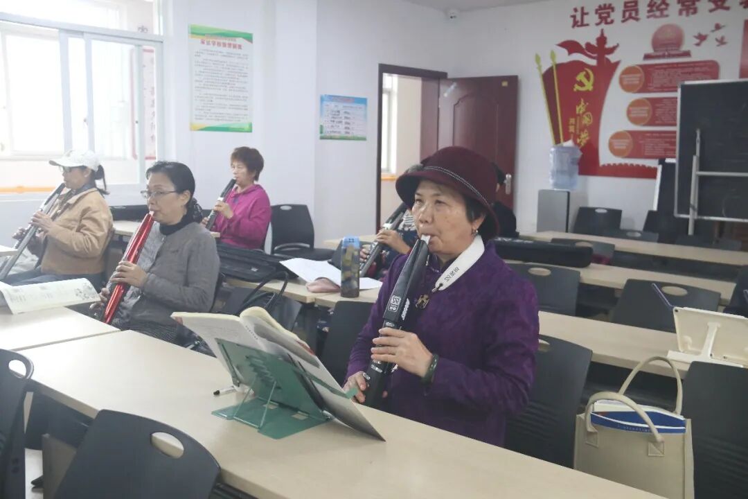 在另一间教室里,电吹管课程同样气氛热烈。学员们手持乐器,专注练习,悠扬的管声在教室里回荡。“老师会根据我们老年人的气息和手指灵活程度,耐心调整教学方法。”学员韦凤哲说,“如今,我的演奏日益熟练,每天都能感受到进步的喜悦。音乐,让我的晚年生活充满快乐与成就感。”