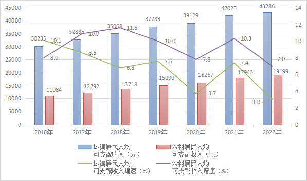32016-2022年城镇、农村居民人均可支配收入及增速