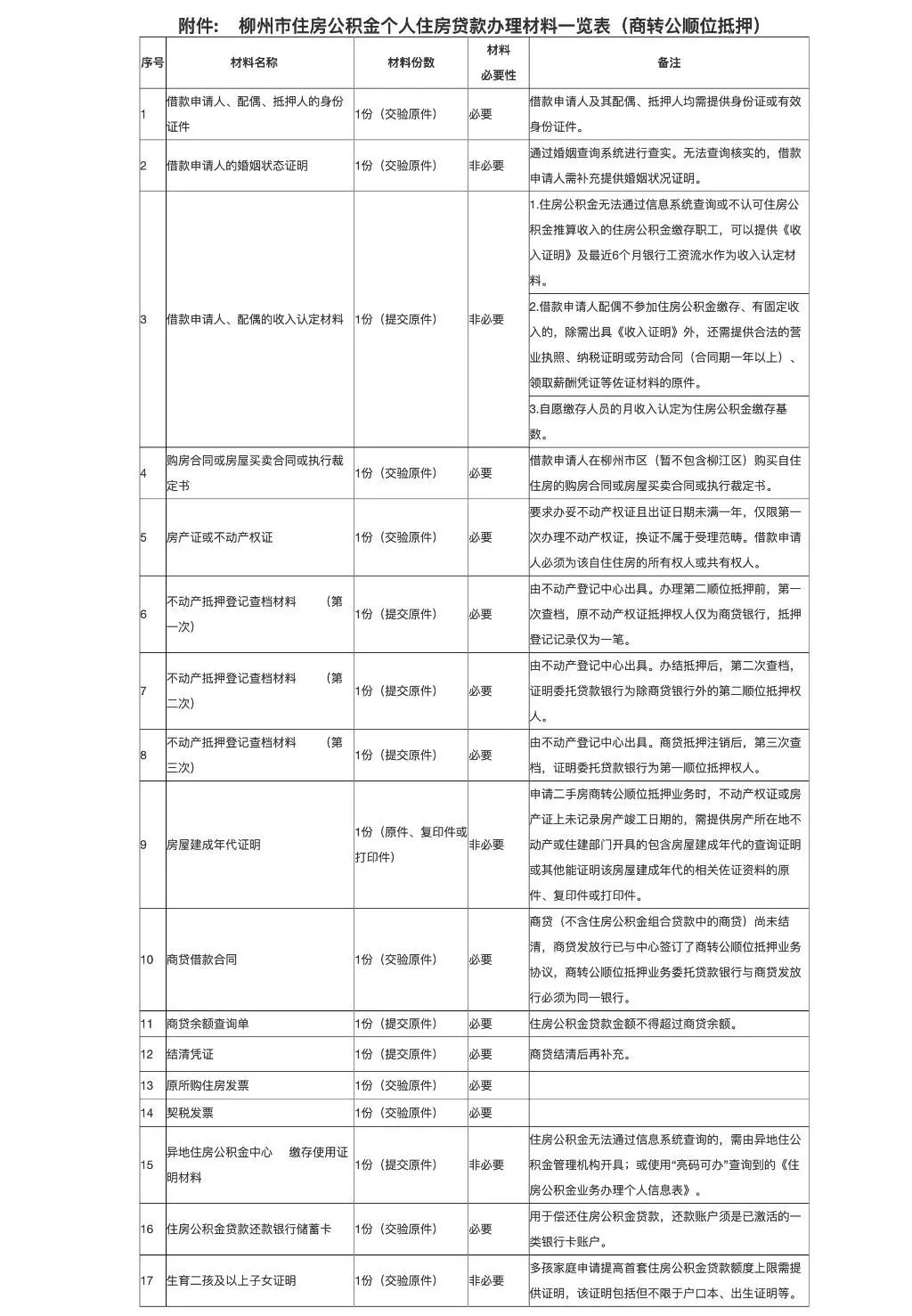 柳州市住房公积金个人住房贷款办理材料一览表(商转公顺位抵押)。
