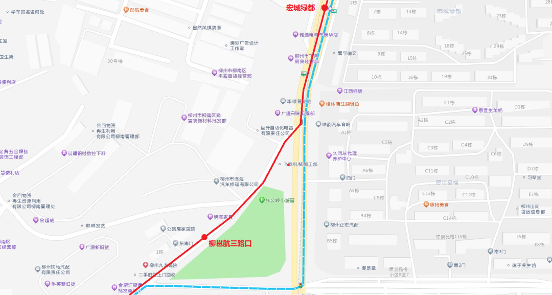 (一)线路走向:上述两条公交线路从柳江区拉堡方向往市中心城区行驶至柳邕路张公岭段(柳邕航三路口)后,调整直行经柳邕路至“宏城绿都”站停靠,再按原线路行驶。