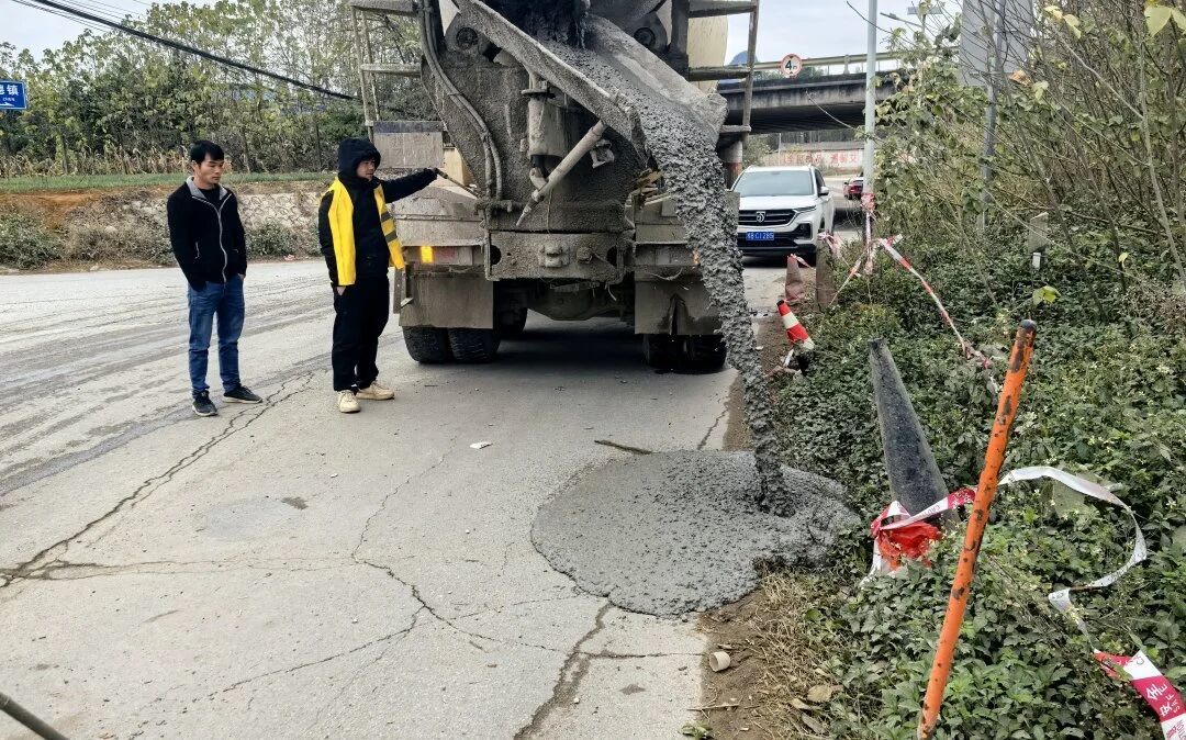 为确保修复方案科学可行、尽快消除安全隐患,柳江区交通运输局主动联合柳江区自然资源局再次赴现场开展细致勘查,结合地质勘察结果与道路通行需求,最终确定采用C20混凝土灌注加固的修复方案;同时积极对接柳州至梧州铁路(柳州段)项目部,达成协作共识。铁路项目部全力配合修复工作,按照既定方案调配资源、准备材料,于1月22日组织施工力量赶赴现场,精准开展塌陷区域回填作业,顺利完成一车混凝土灌注施工,高效推进修复工程落地见效。