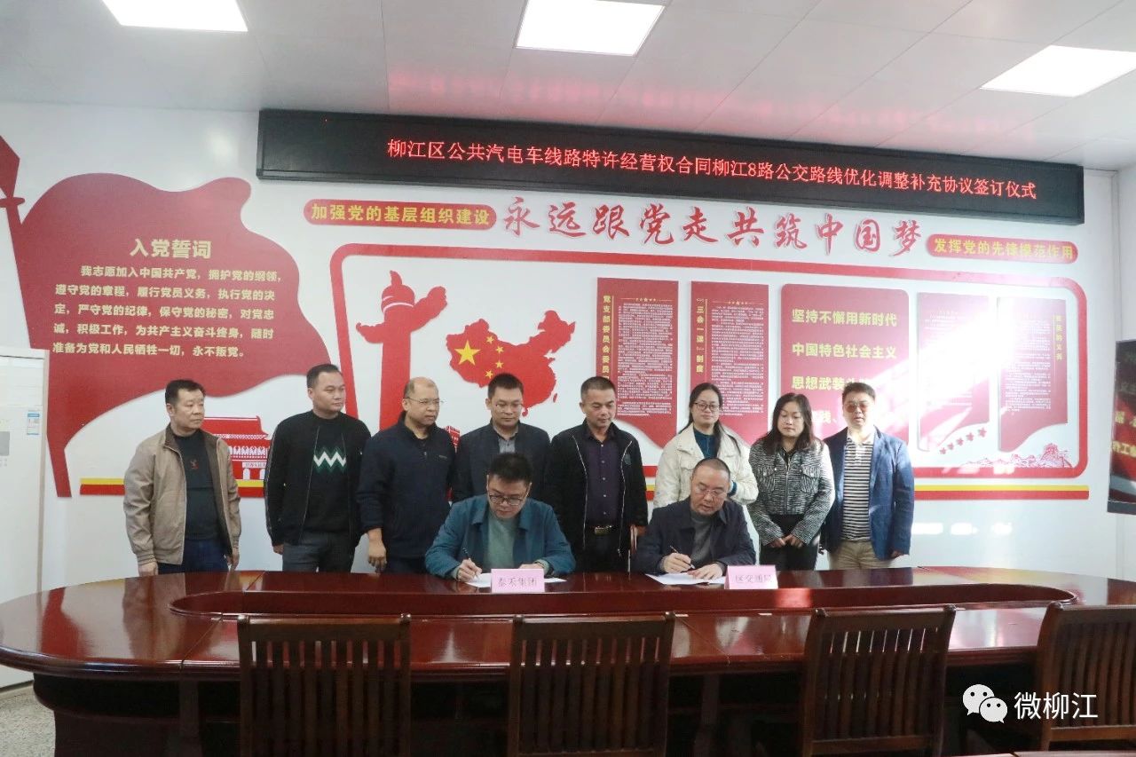 12月8日,柳江区公共汽电车线路特许经营权合同柳江8路公交路线优化调整补充协议签订仪式在柳江区交通运输局举行。该补充协议进一步调整了柳江8路(拉堡至穿山)公交线路,满足了广大群众多样化便捷出行的需求。