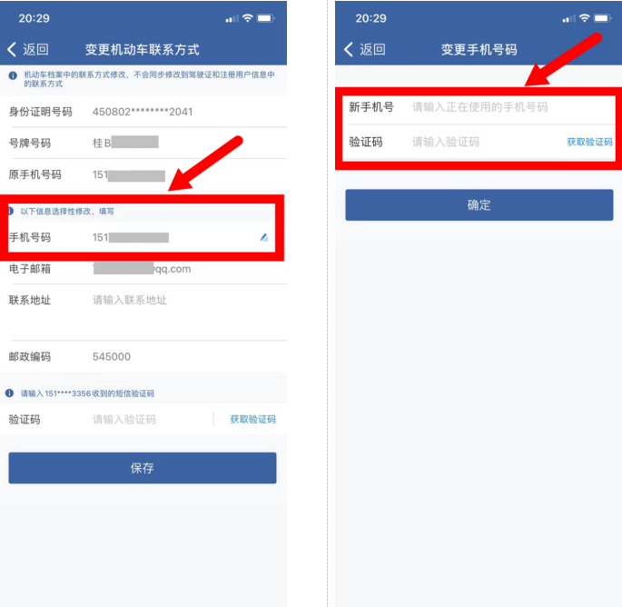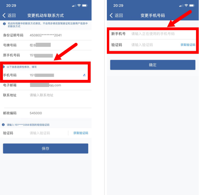 3、进入变更驾驶证联系方式页面,点击红框处填写修改新的手机号码,填入新手机号码,获取验证码→获取原绑定手机号验证码,点击【保存】→保存驾驶证联系方式,点击【确定】,驾驶证联系方式成功完成修改。