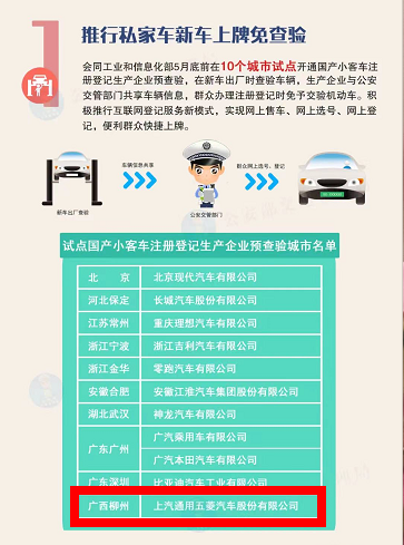 此次修订固化公安部近年来已推出的交管改革措施,推进改革成果制度化、法治化,并回应群众新要求新期待,再推出5项便利机动车登记新措施。一是推行私家车新车上牌免查验。会同工业和信息化部5月底前在10个城市试点开通国产小客车注册登记生产企业预查验,实行新车出厂时查验车辆,生产企业与公安交管部门共享车辆信息,群众办理注册登记时免予交验机动车。积极推行互联网登记服务新模式,实现网上售车、网上选号、网上登记,便利群众快捷上牌,助力汽车行业发展。在试点基础上,全国逐步推行。