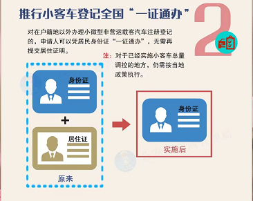 二是推行小客车登记全国“一证通办”。对在户籍地以外办理小微型非营运载客汽车注册登记的,申请人可以凭居民身份证“一证通办”,无需再提交居住证明。对于已经实施小客车总量调控的地方,仍需按当地政策执行。