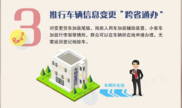 三是推行车辆信息变更“跨省通办”。对变更货车加装尾板、残疾人用车加装辅助装置、小客车加装行李架等情形,群众可以在车辆所在地申请办理,无需返回登记地验车。