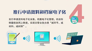 四是推行申请资料和档案电子化。实行申请资料电子化采集、档案电子化管理,机动车转籍信息网上转递,实现交管业务办理“减环节、减材料、减时限”。