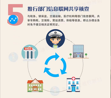 五是推行部门信息联网共享核查。与税务、银保监、交通运输等部门信息联网,共享车购税、交强险、营运资质等信息,群众办理业务时免予提交相关证明凭证。