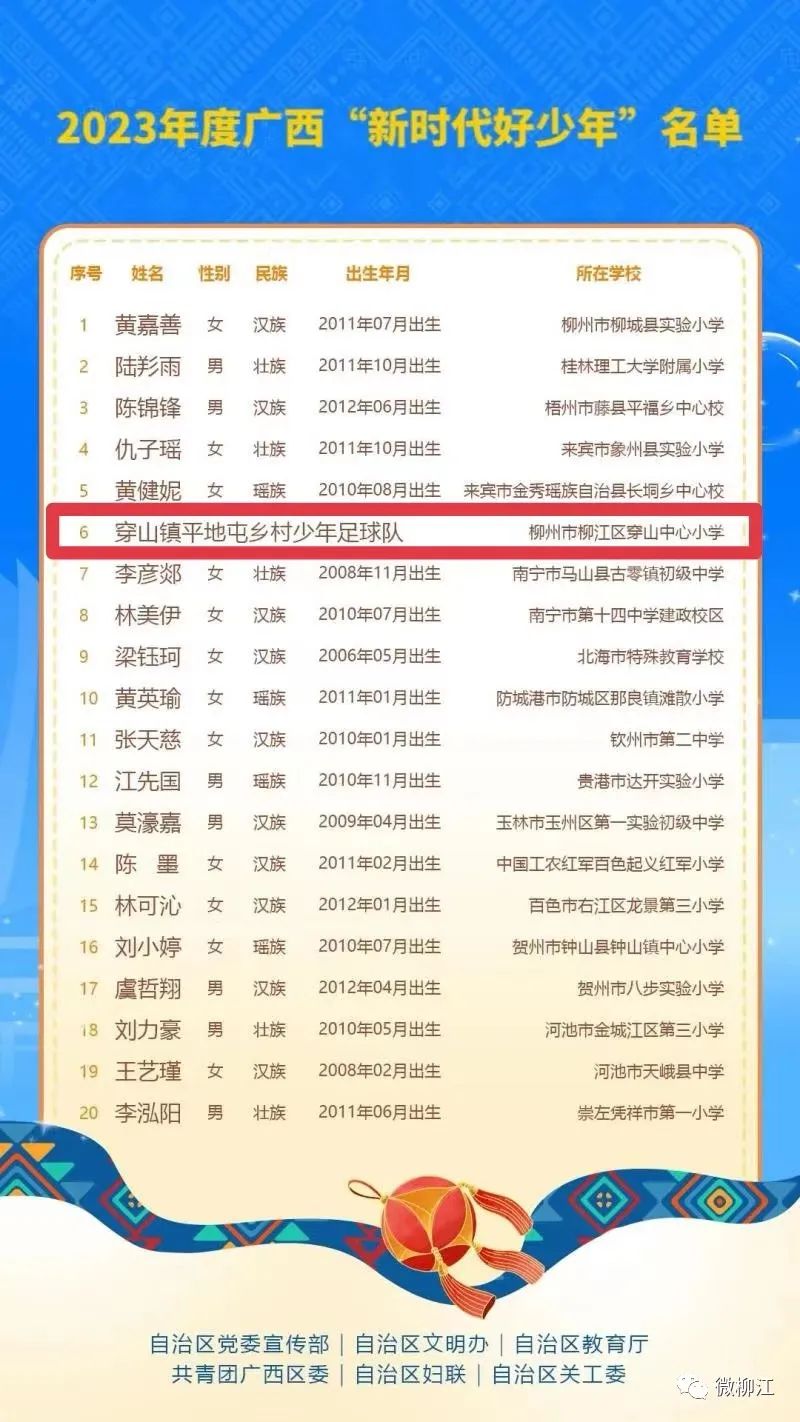 近日,2023年度广西“新时代好少年”名单公布,广西共有20名学生(集体)入选。其中,来自柳州市柳江区穿山中心小学的穿山镇平地屯乡村少年足球队上榜。
