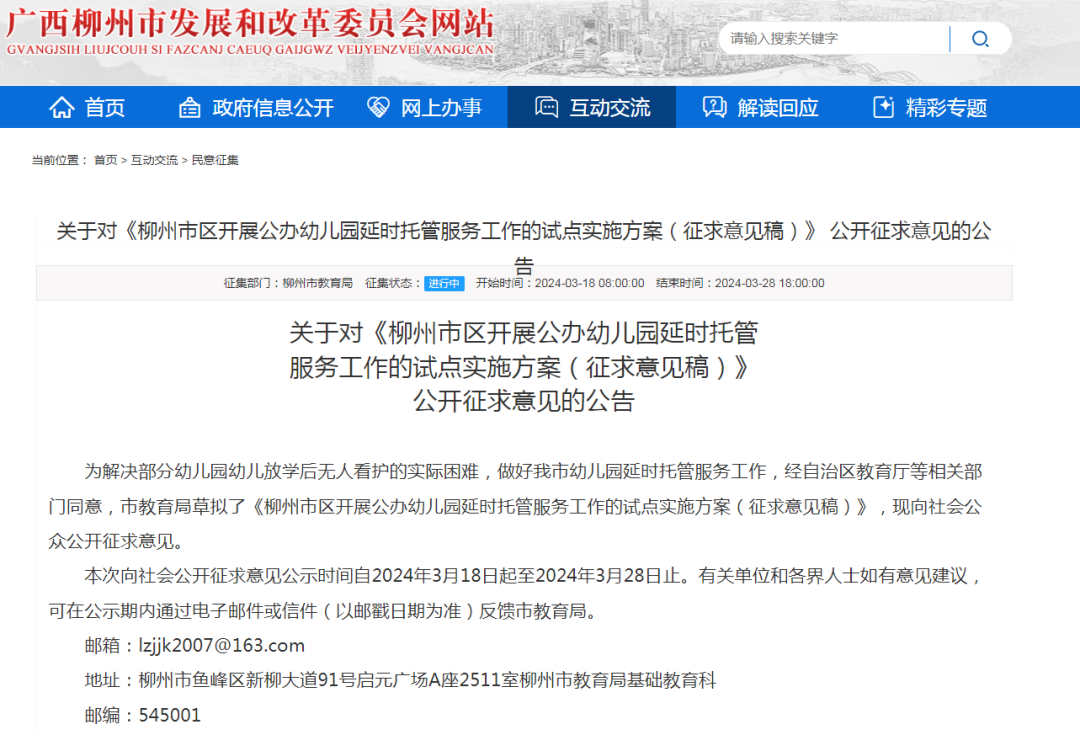 如何解决部分幼儿园幼儿放学后无人看护的实际困难?欢迎您来提意见!3月18日,市发展改革委公示了《柳州市区开展公办幼儿园延时托管服务工作的试点实施方案(征求意见稿)》(以下简称“征求意见稿”),即日起至3月28日向社会公开征求意见。