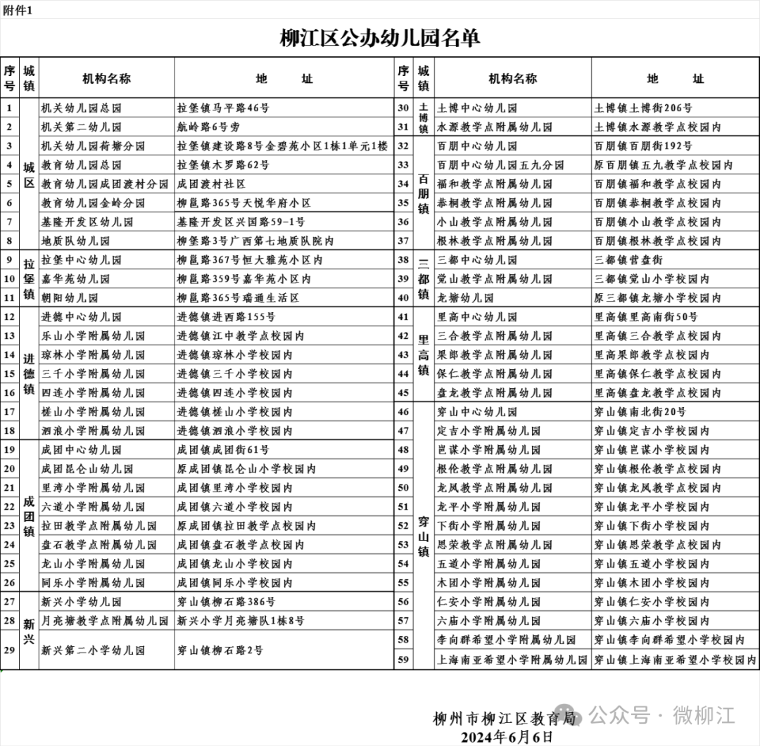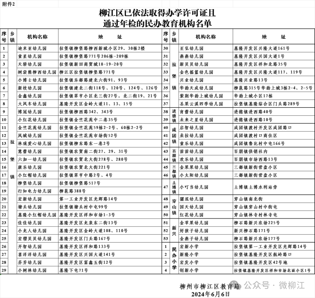 现将2024年柳江区辖区范围内公办幼儿园、有办学资质且通过年检合法招生的民办幼儿园名单在“柳江区人民政府门户网站”http://www.liujiang.gov.cn/公告栏、柳江教育、微柳江上进行公布,欢迎社会各界和家长进行监督。同时,敬请各位家长提高警惕,不要将子女送到非法举办的学校、幼儿园就读。