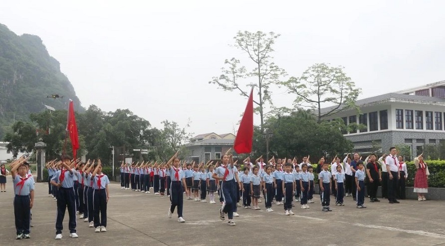 区委常委、宣传部部长,区委教育工委书记黄辉;区委教育工委副书记,区教育局党组书记、局长韦献高;团区委书记蓝雯馨为新建中队授中队旗,火红的旗帜象征着红色精神的传承。