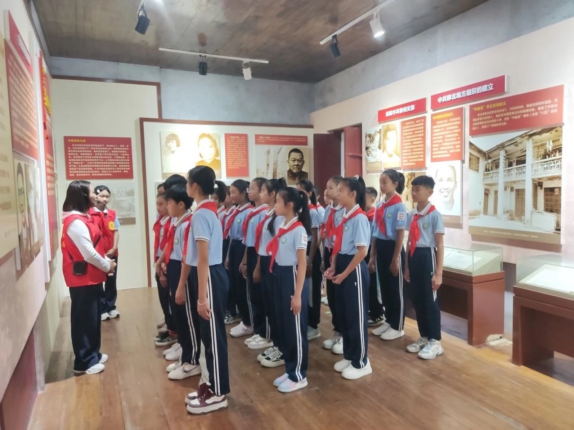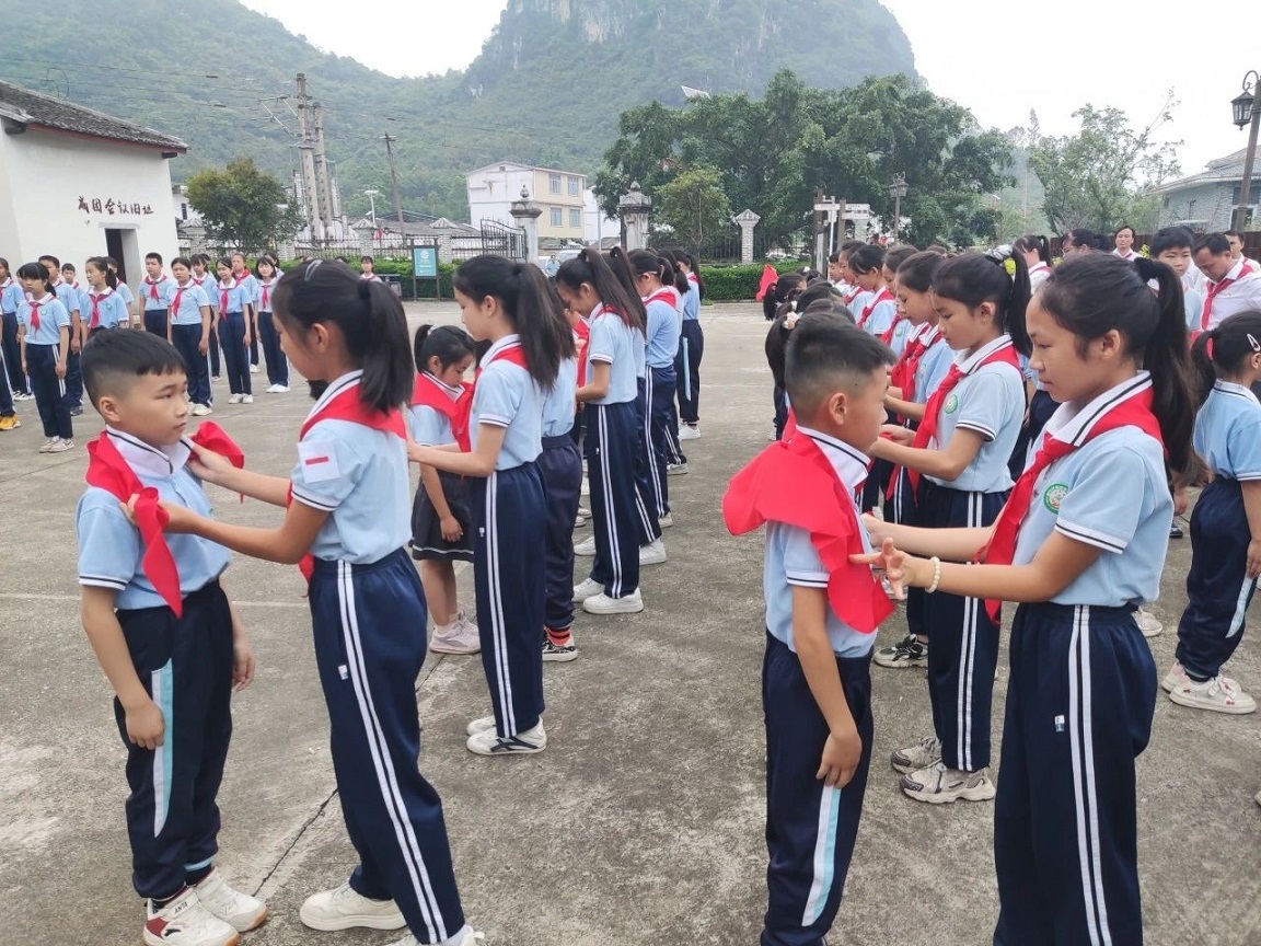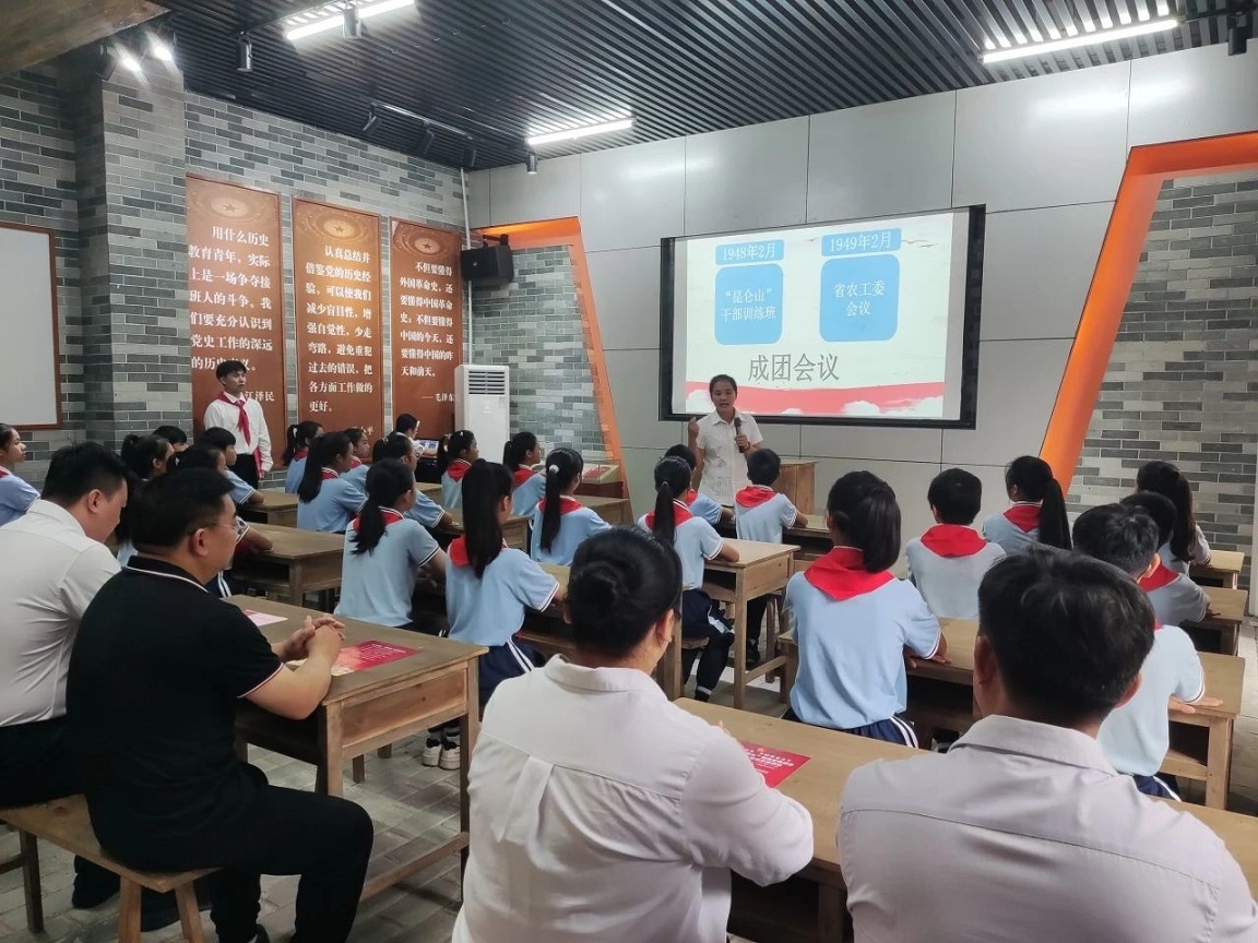 成团中心小学党支部书记覃露霞讲授《找寻先辈足迹,争做时代好队员》的思政课,带领大家重温成团会议旧址的革命历史,传承红色基因,厚植家国情怀。