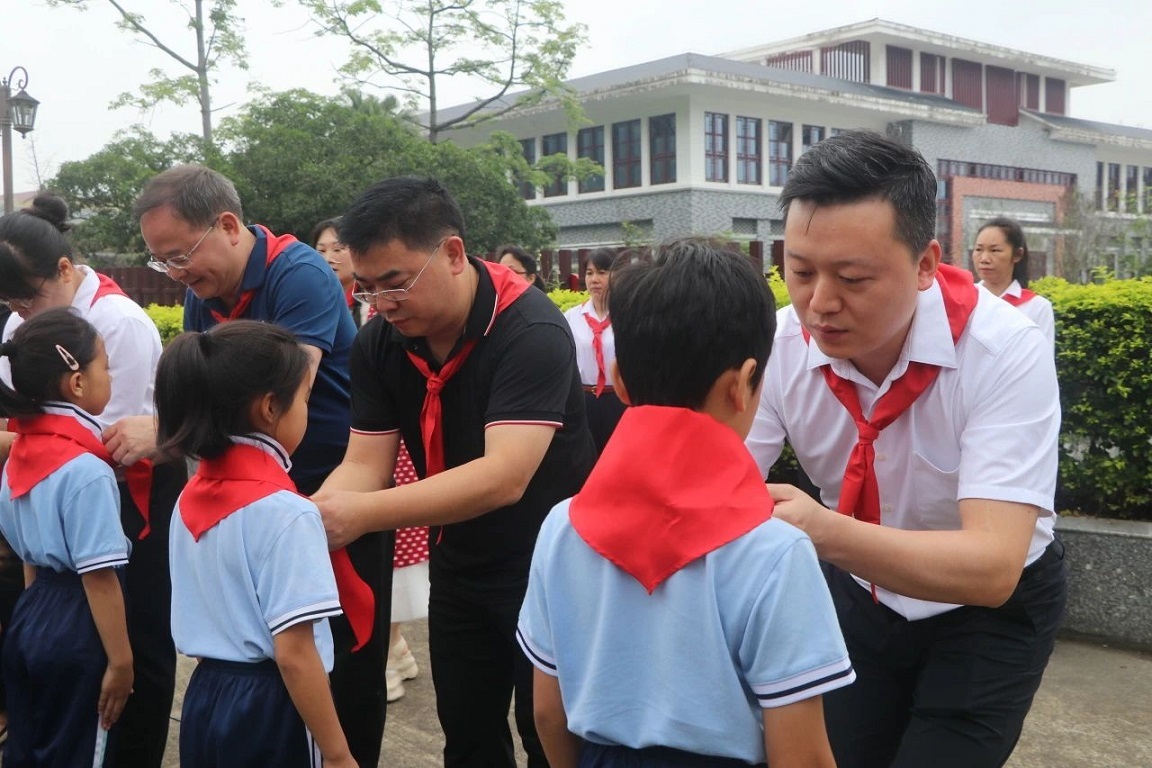 区委常委、宣传部部长,区委教育工委书记黄辉;区委教育工委副书记,区教育局党组书记、局长韦献高;团区委书记蓝雯馨为新建中队授中队旗,火红的旗帜象征着红色精神的传承。