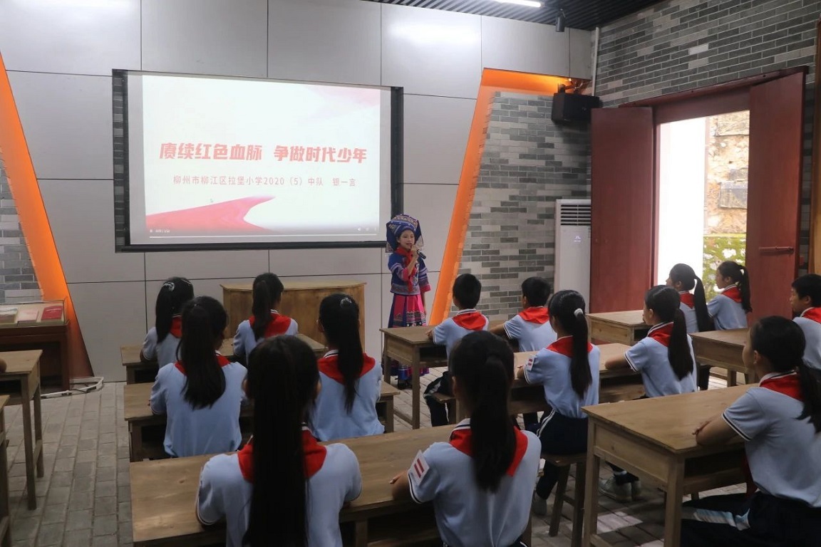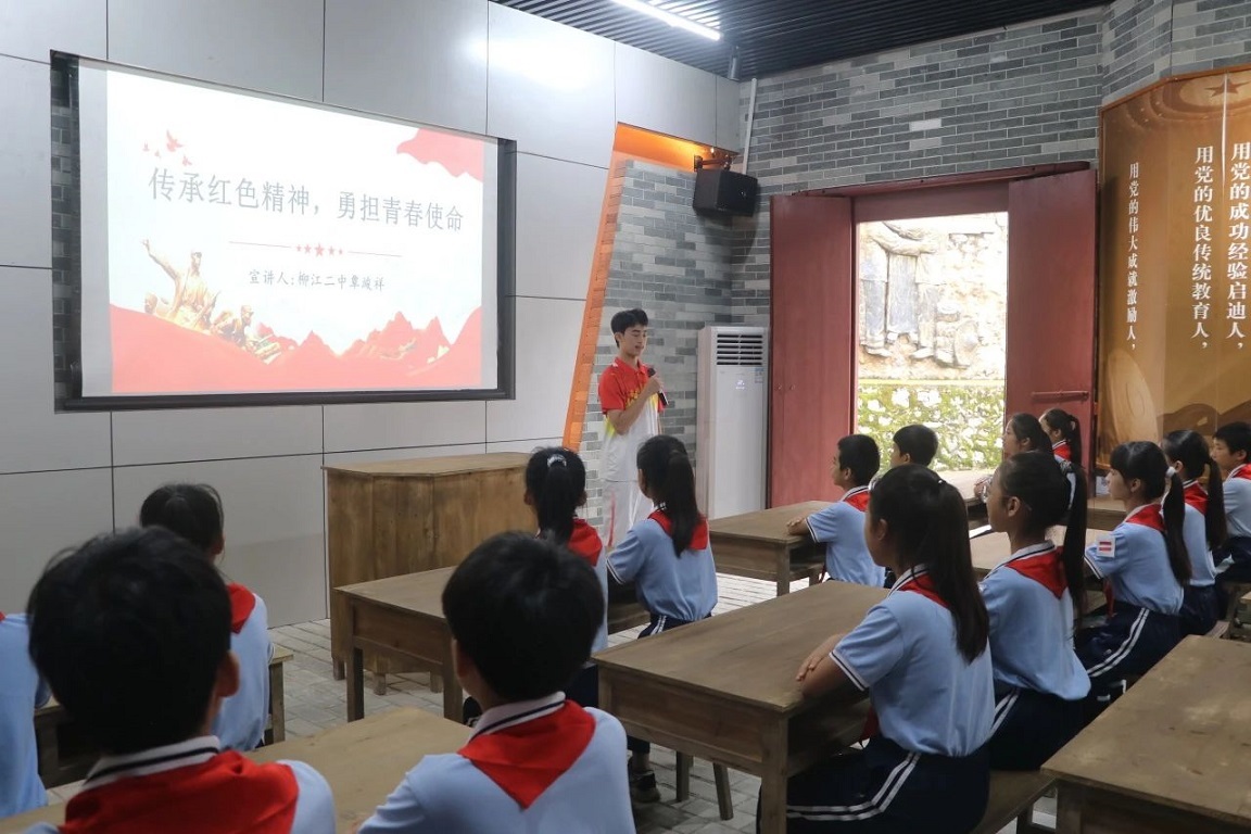 柳江区“江音嘹亮”宣讲团成员、“10后话百年”优秀宣讲员代表覃竣祥进行《传承红色精神,勇担青春使命》的宣讲,引导少先队员深刻领会红色精神内涵,坚定理想信念。