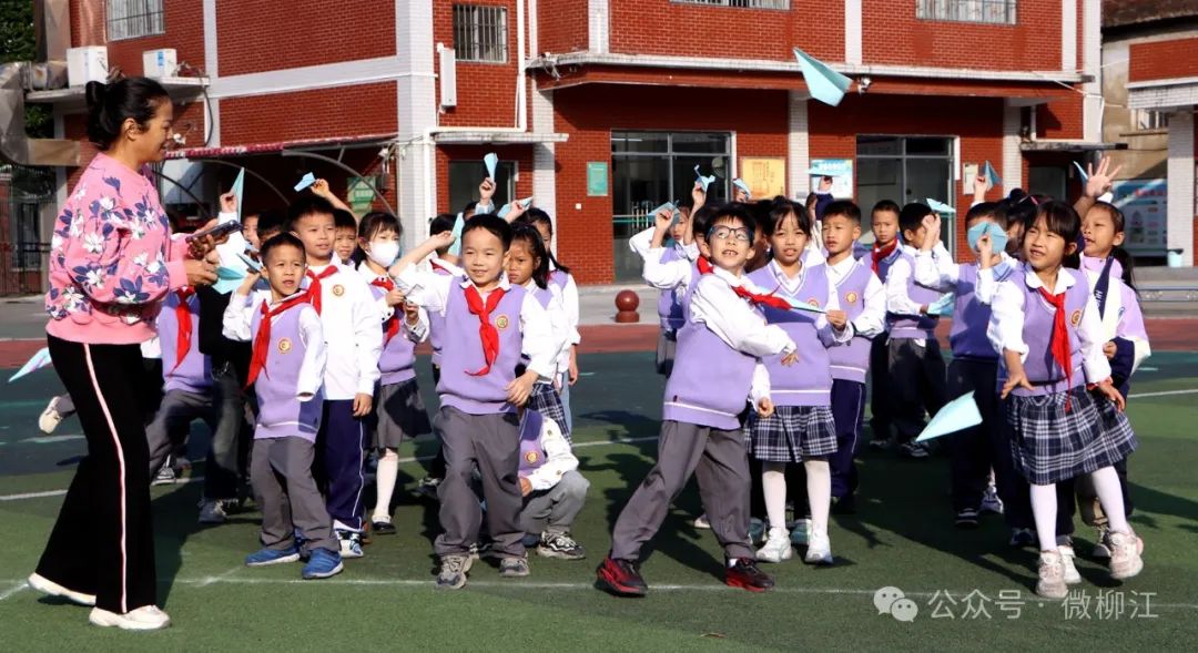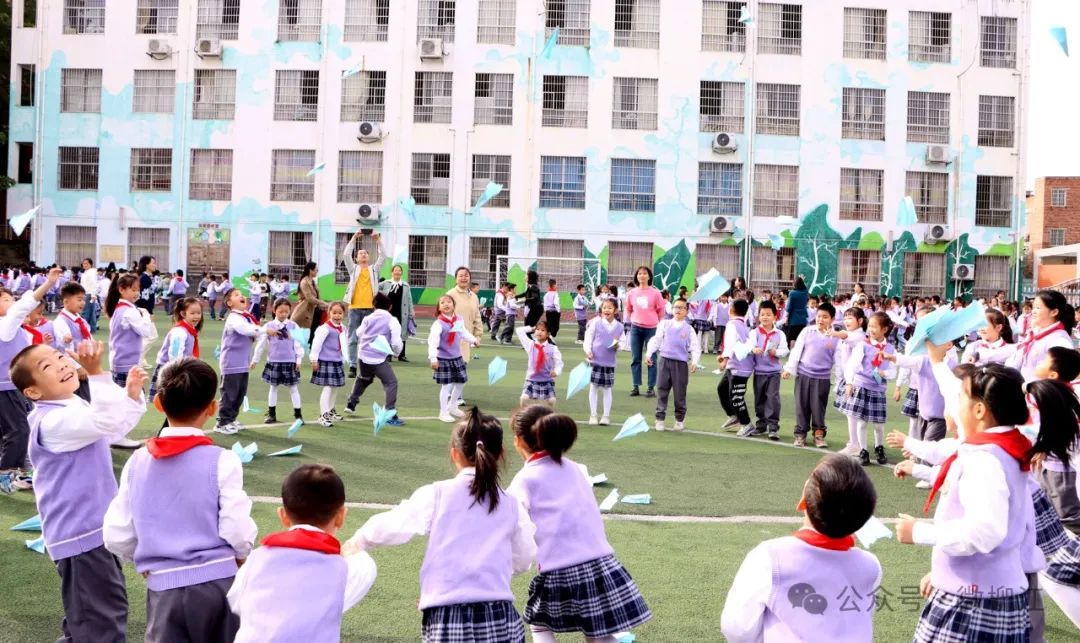 活动现场还开展了 “蓝色梦想,快乐飞翔”活动。在老师的带领下,一、二年级学生围圈坐在一起,举着写满心愿的纸飞机,一声令下,承载着孩子们对未来的憧憬与期待的纸飞机飞向天空,翱翔在校园上方。