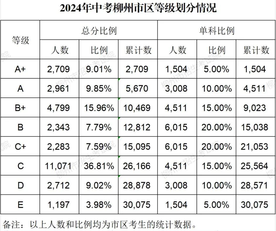 7月8日,柳州中考招生网公布2024年中考柳州市区等级划分情况,市区总分A+2709人,总分A等及以上共5670人,总分C等及以上共26166人。