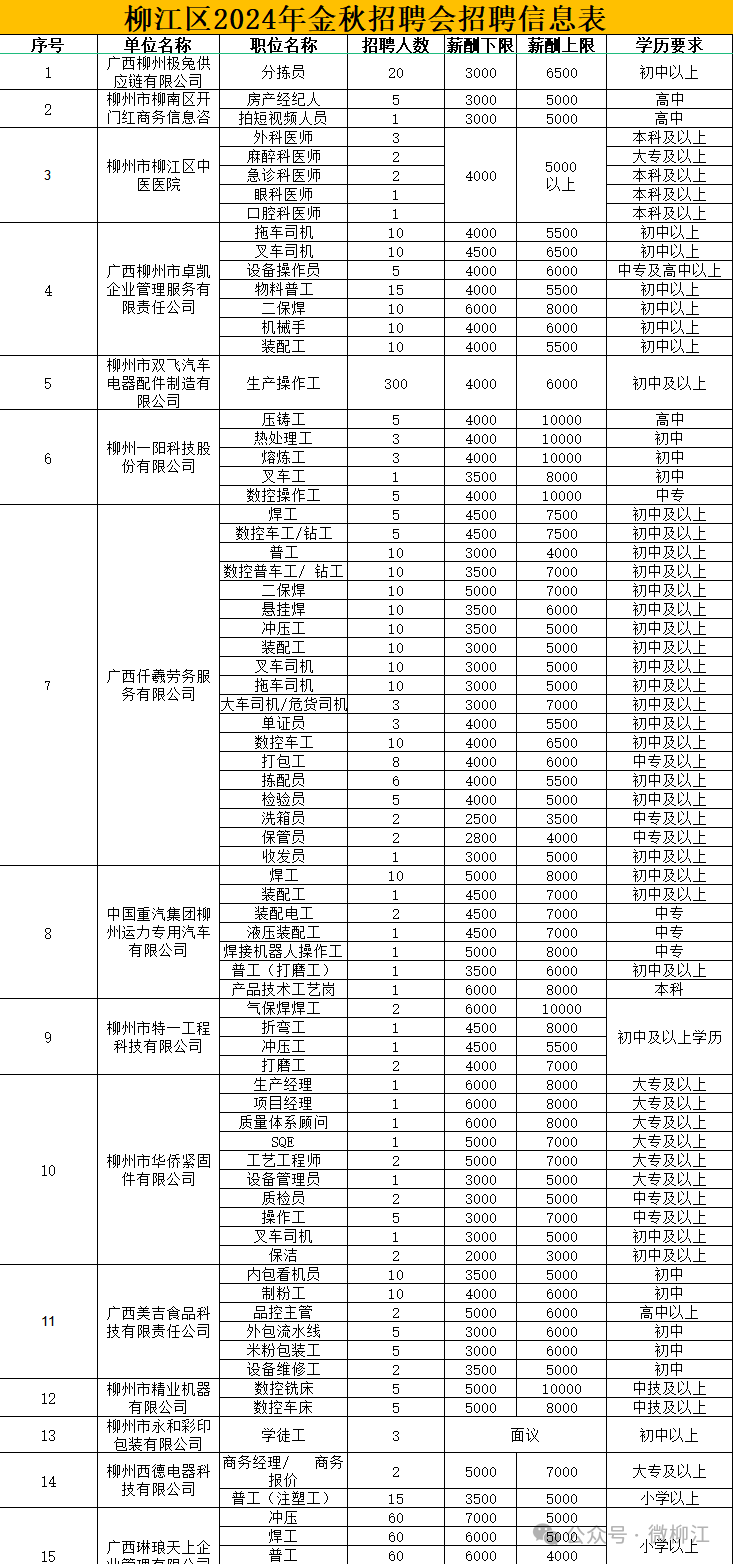 为深入贯彻党的二十届三中全会精神,贯彻落实党中央、国务院促进高质量充分就业决策部署,重点做好高校毕业生、农村劳动力、脱贫劳动力、退役军人、登记失业人员和就业困难人员等特殊群体的就业创业工作,根据自治区、柳州市工作部署,柳江区定于2024年10月25日(星期五)在区人民文化宫广场开展以“‘就’在金秋 ‘职’面未来”为主题的2024年金秋招聘月专场招聘会。