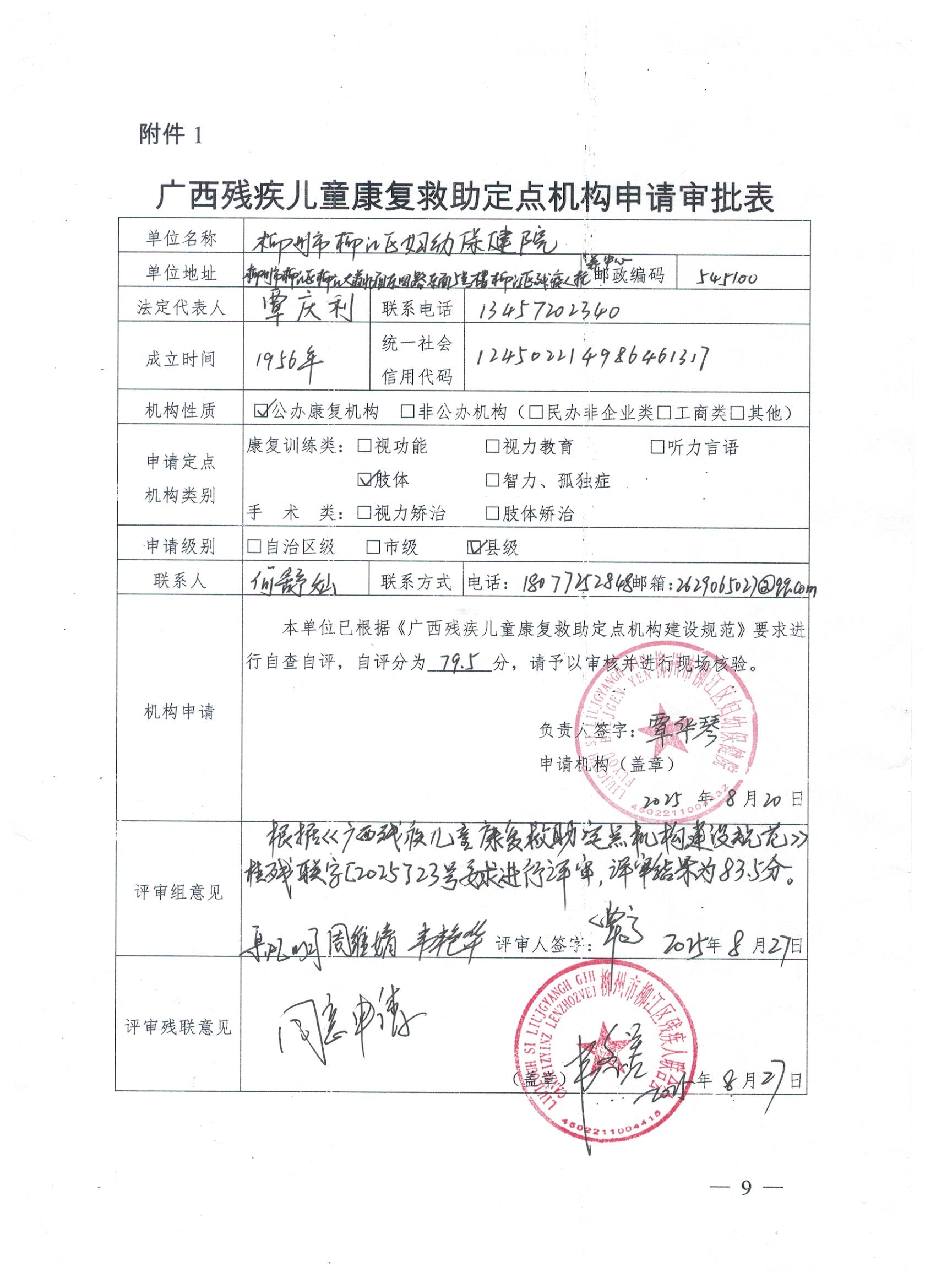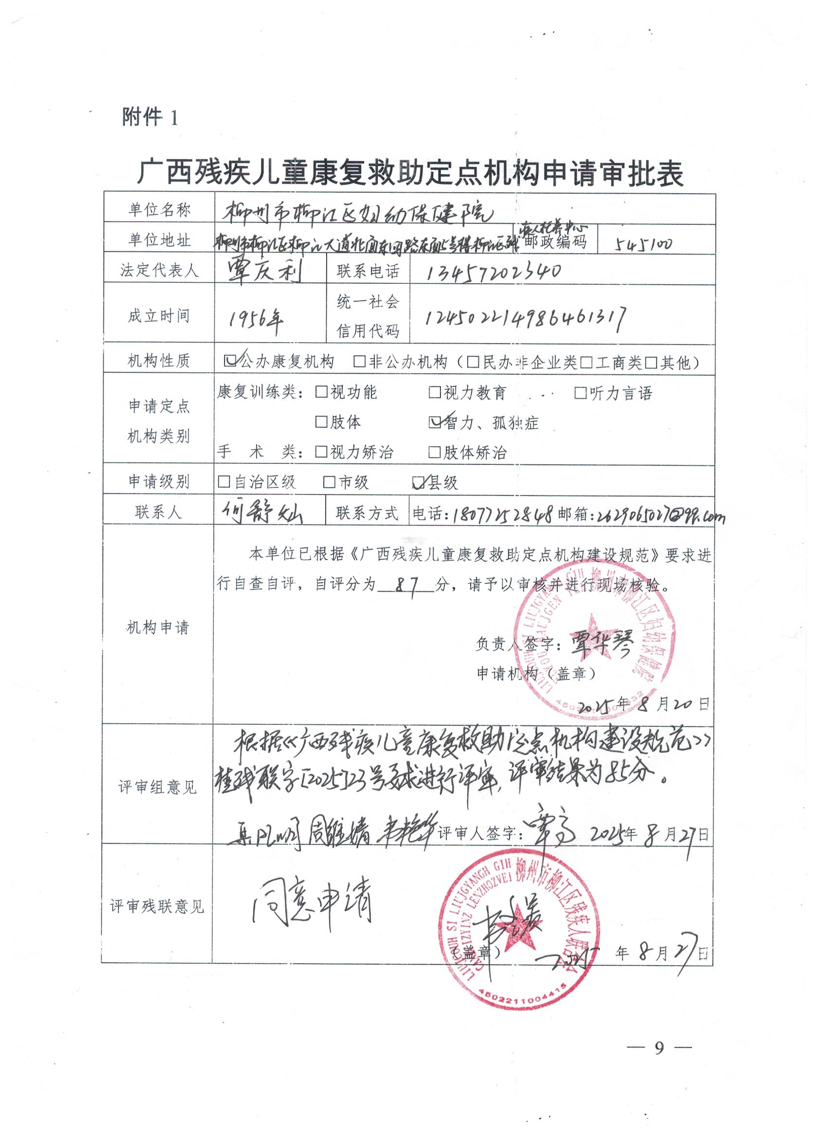 关于县级残疾儿童康复救助定点机构柳江区妇幼保健院迁址后再评审结果的公示