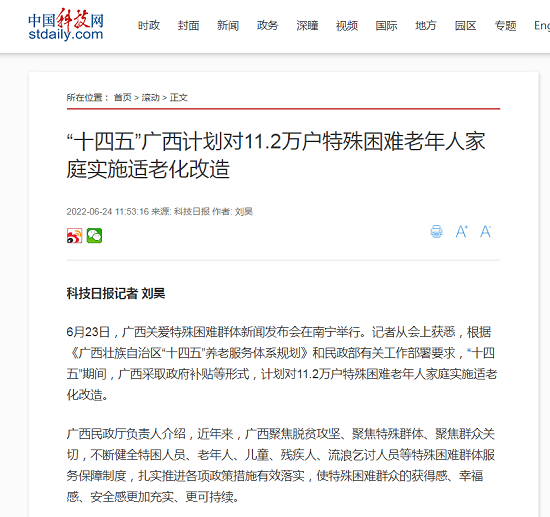 6月23日,广西关爱特殊困难群体新闻发布会在南宁举行。记者从会上获悉,根据《广西壮族自治区“十四五”养老服务体系规划》和民政部有关工作部署要求,“十四五”期间,广西采取政府补贴等形式,计划对11.2万户特殊困难老年人家庭实施适老化改造。