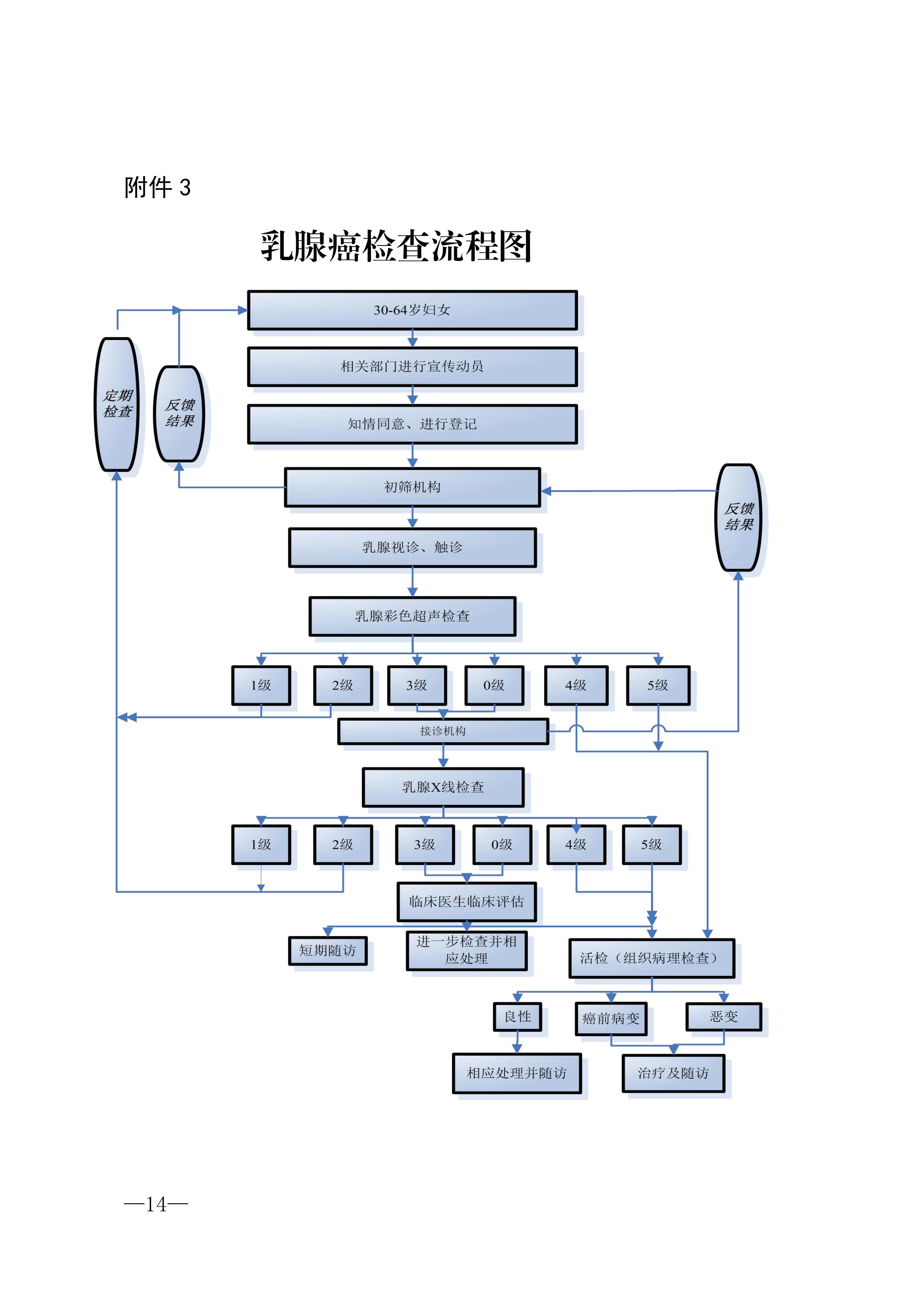3.组织病理检查:对乳腺彩超检查BI-RADS分级4级和5 级、X线检查BI-RADS分级4级和5级者应当直接进行组织病理学检查(以下简称活检,乳腺癌检查项目检查流程图见附3)。