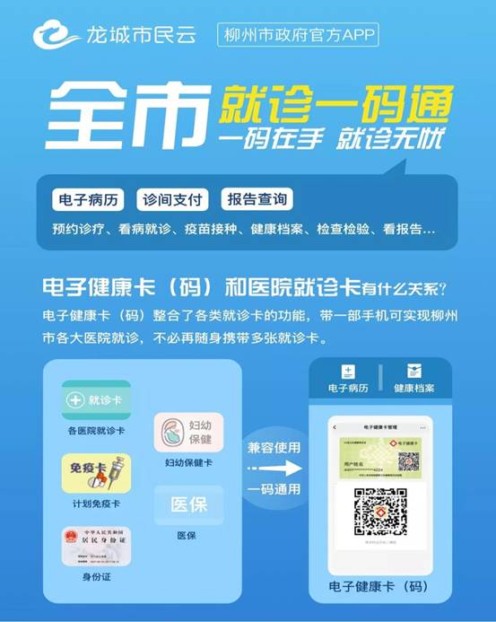 这项功能是柳州市以市民为中心打造的一站式“互联网+”公共服务之一。开发的“龙城市民云”APP,作为为市民服务的平台,提供民生保障、家庭生活、交通旅游、医疗健康等贴心、便捷的服务,让市民告别就诊“多卡时代”,实现“就诊一码通”。目前,柳江区人民医院、区妇幼保健院、拉堡、百朋、三都、成团、里高镇乡镇卫生院,已经全部启用了“电子健康卡”。到院就诊的患者,不必再先办理就诊卡。只要智能手机上安装了“龙城市民云”APP,注册了身份信息,点击APP里的“医疗健康”就会出现一张电子健康卡,点击健康卡就会出现一个二维码,挂号、就诊、缴费、查询报告单都可以凭这个二维码完成,就相当于以前的就诊卡,不同的是,这个二维码全市医院通用。