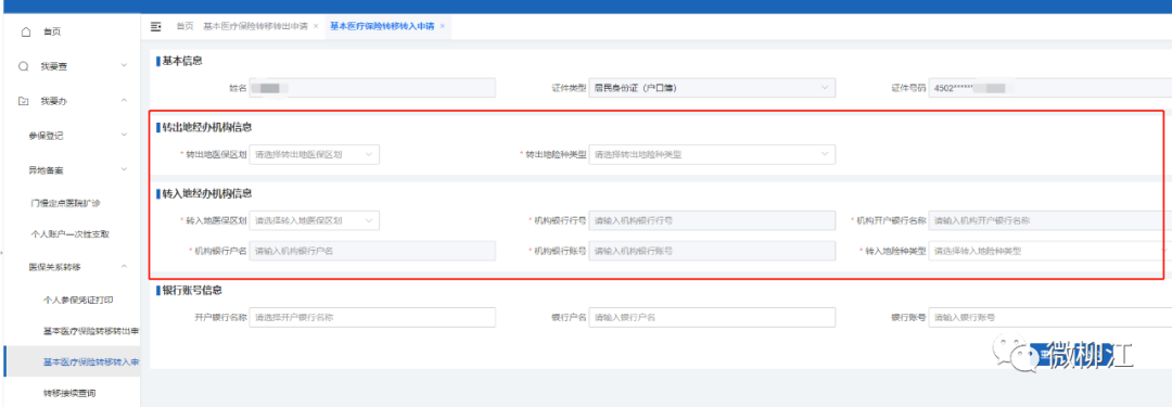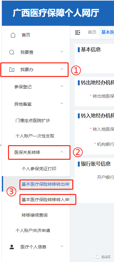 ③依次点击“我要办”→“医保关系转移”→“基本医疗保险转移转出申请”或“基本医疗保险转移转入申请”